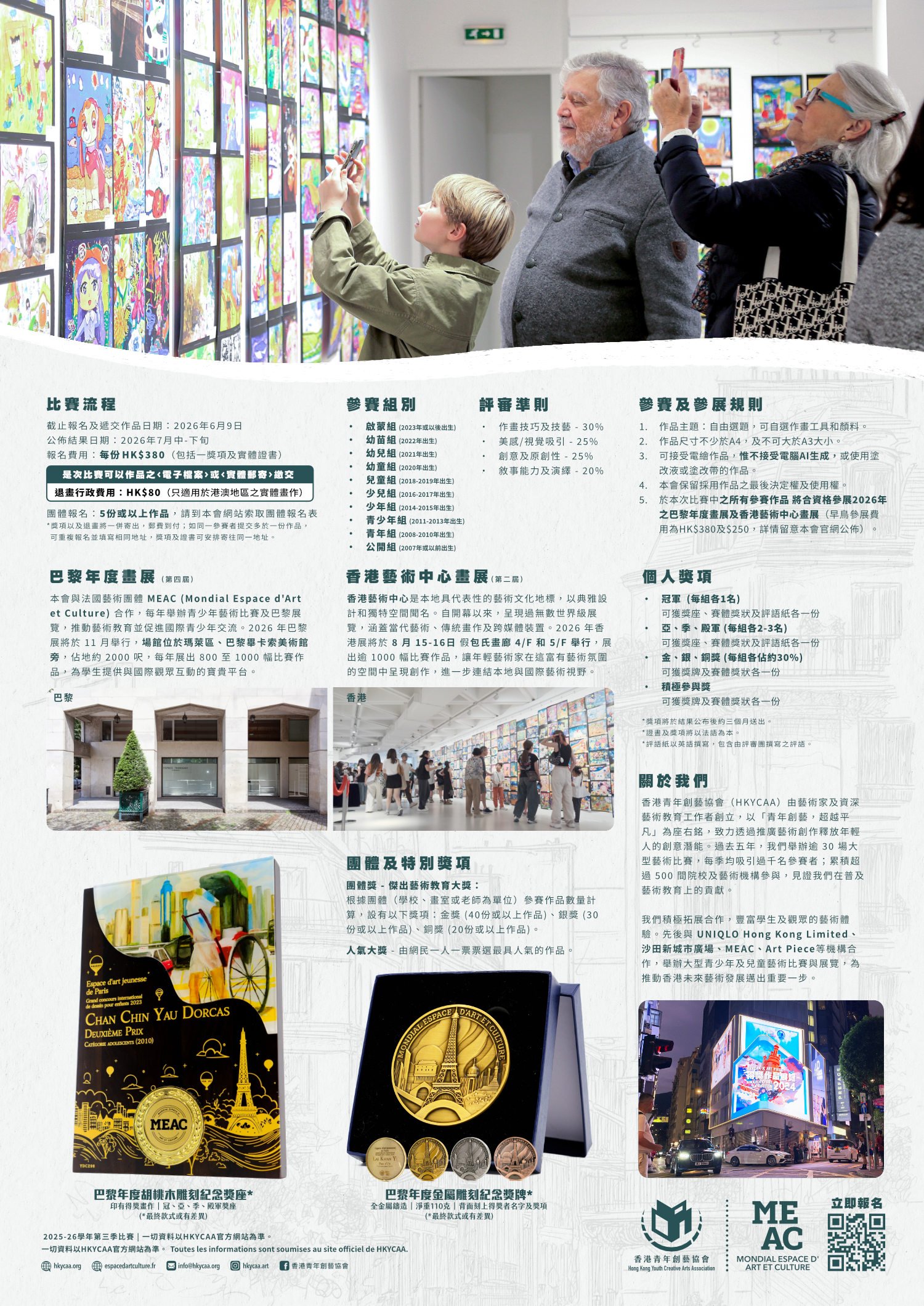 MEAC (Mondial Espace d'Art et Culture /「世界文化藝術空間」) 致力於推廣普及藝術教育與藝術表達自由。這次由兩地共同舉辦的繪畫大賽,將為您打開一扇通往世界的窗戶。HKYCAA 及 MEAC 將一起評審參賽作品,並在巴黎舉辦得獎作品展覽。您的藝術將成為文化傳承的一部分,啟發更多人探索創意與夢想。